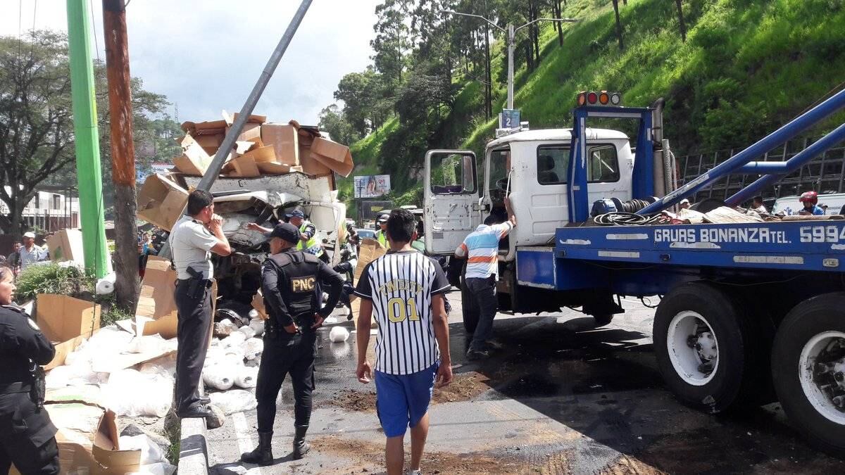 Dalia Santos, vocera de la Policía Municipal de Tránsito (PMT) de Villa Nueva, explicó que son al menos ocho vehículos los involucrados en el percance. Y que se reporta una persona herida.