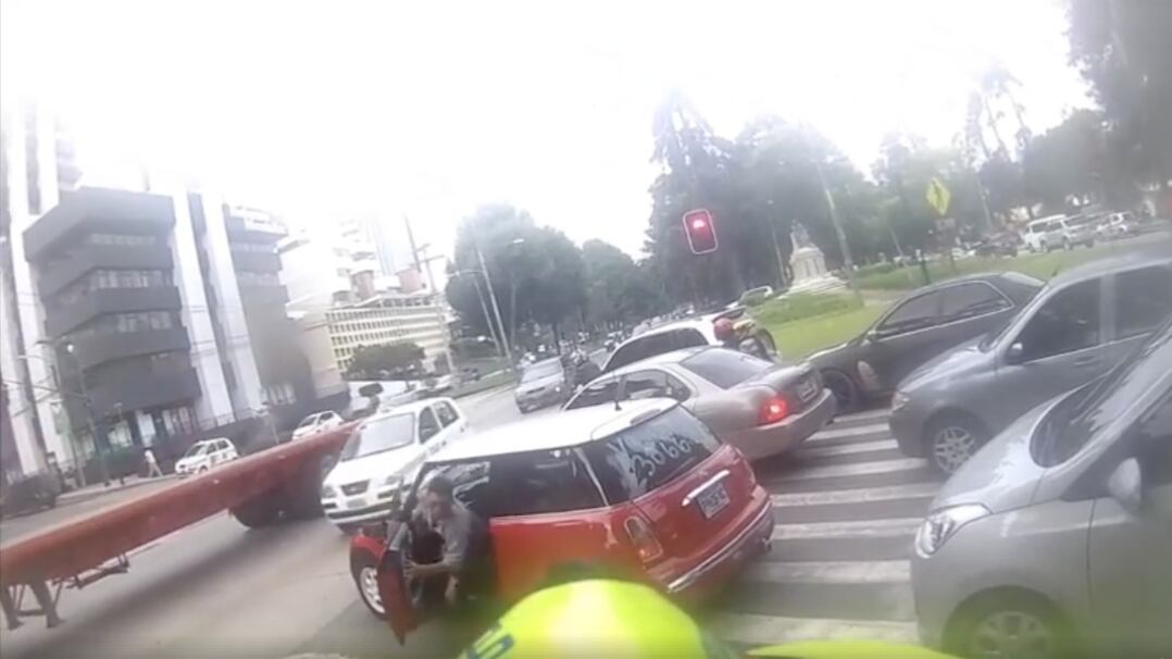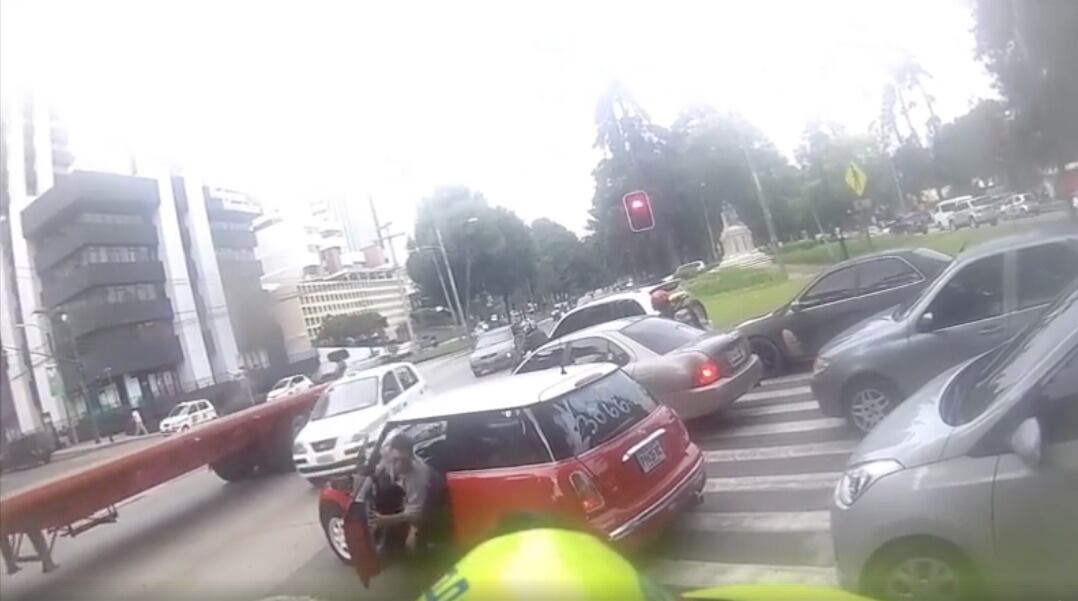 En las imágenes se observa al adulto mayor intentado pasarse el trayecto de la avenida reforma y 12 calle de la zona 10 sobre el paso peatonal, durante las horas pico en las que el semáforo se encuentra con luz roja intermitente.