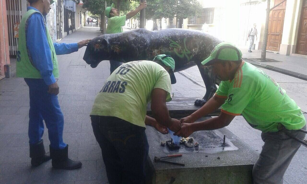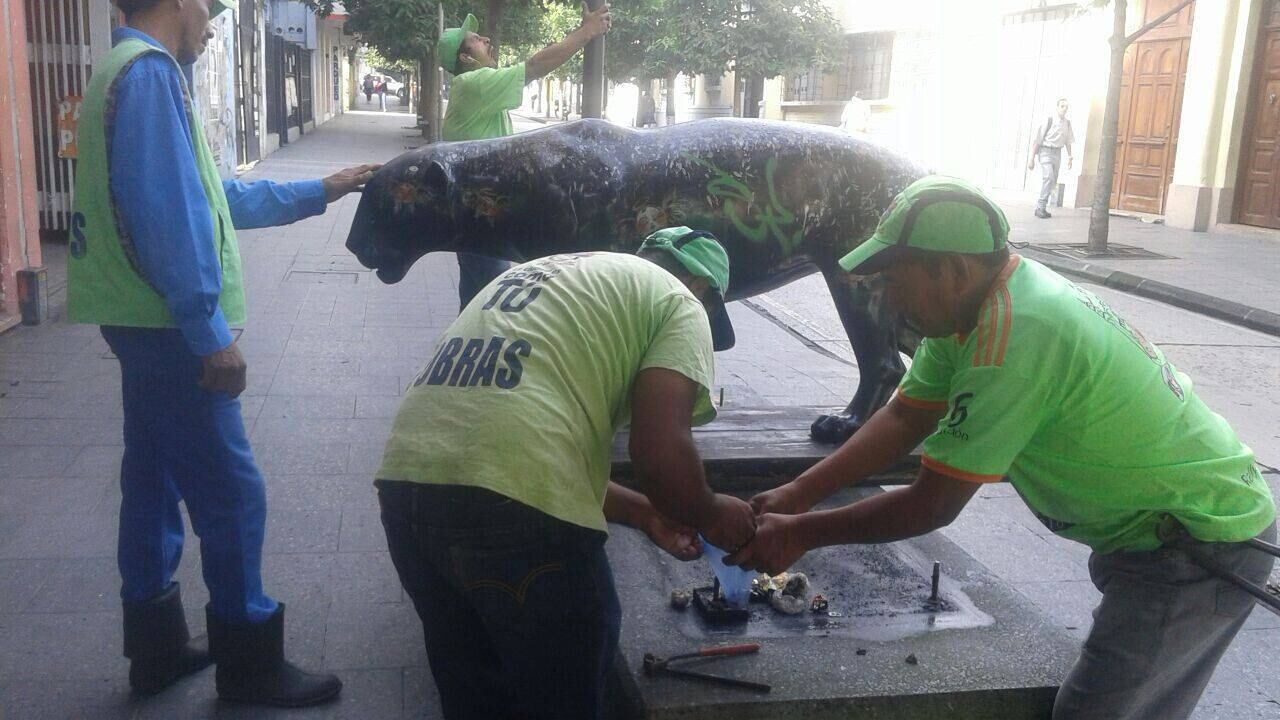 Se informó que se tomó la decisión de retirar a los jaguares porque estos fueron manchados con aerosol. La Municipalidad de Guatemala asegura que las pintas atentan contra el trabajo del artista y de la pieza que es parte del patrimonio cultural del paseo de La Sexta.