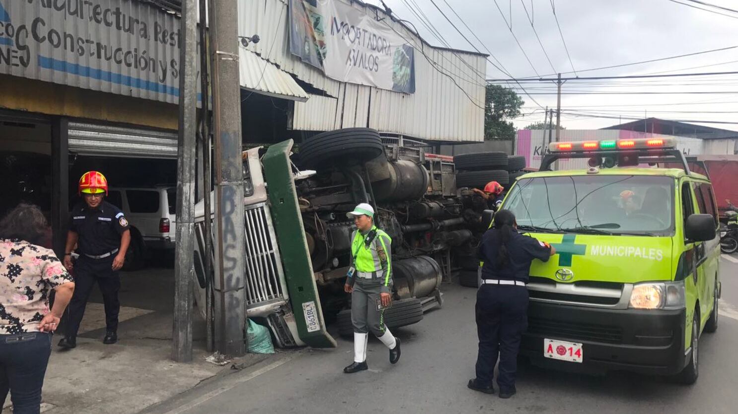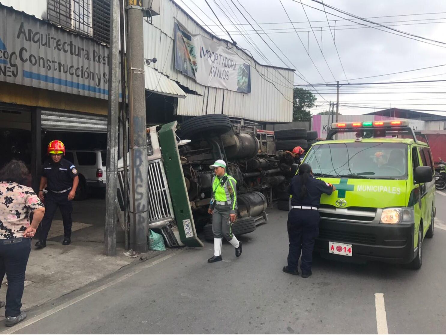 Este sábado un tráiler dio vuelta en la 10 avenida Calle Martí zona 2 de la capital. Amílcar Montejo, intendente de la Policía Municipal de Tránsito (PMT), informó que la mitad del tráiler quedó en el asfalto y la otra mitad dentro de un negocio ubicado en ese sector.