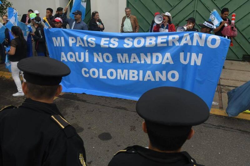 Las personas llevaron pancartas con varias consignas como "vende patria", "afuera tal Iván", "mi país es soberano, aquí no manda un colombiano" y "cicig sí, Iván no", entre otras, las cuales también se hicieron notar en piñatas que fueron colocadas a lo largo del cordón policial.