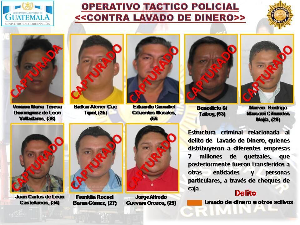 El Ministerio Público (MP) y la Policía Nacional Civil (PNC) capturaron este jueves a ocho personas señaladas del delito de lavado de dinero, quienes estarían vinculadas con la sustracción de Q7 millones de una entidad bancaria, los cuales habrían obtenido por medio de un sobregiro.
