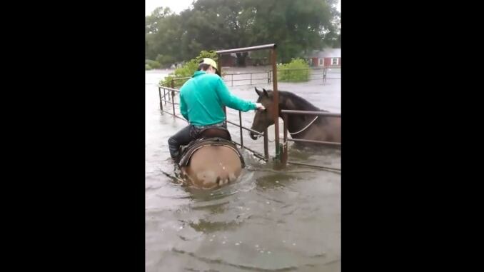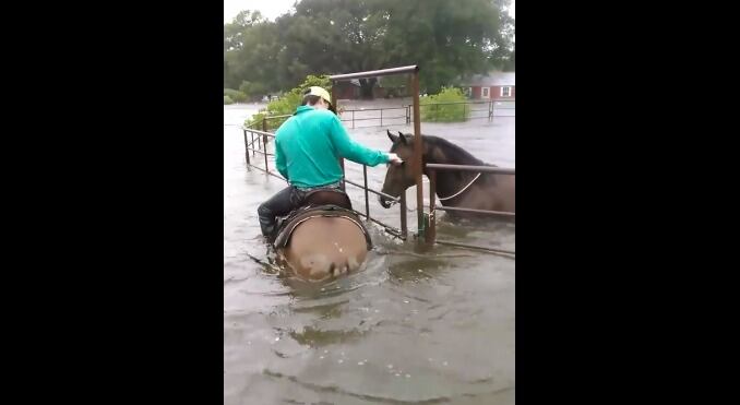 Una de ellas ocurrió en un rancho de la localidad de Cleveland, en Texas, donde un valiente vaquero identificado como Rowdy Ward acudió al rescate de un caballo que había quedado atrapado por las inundaciones, señalan medios.
