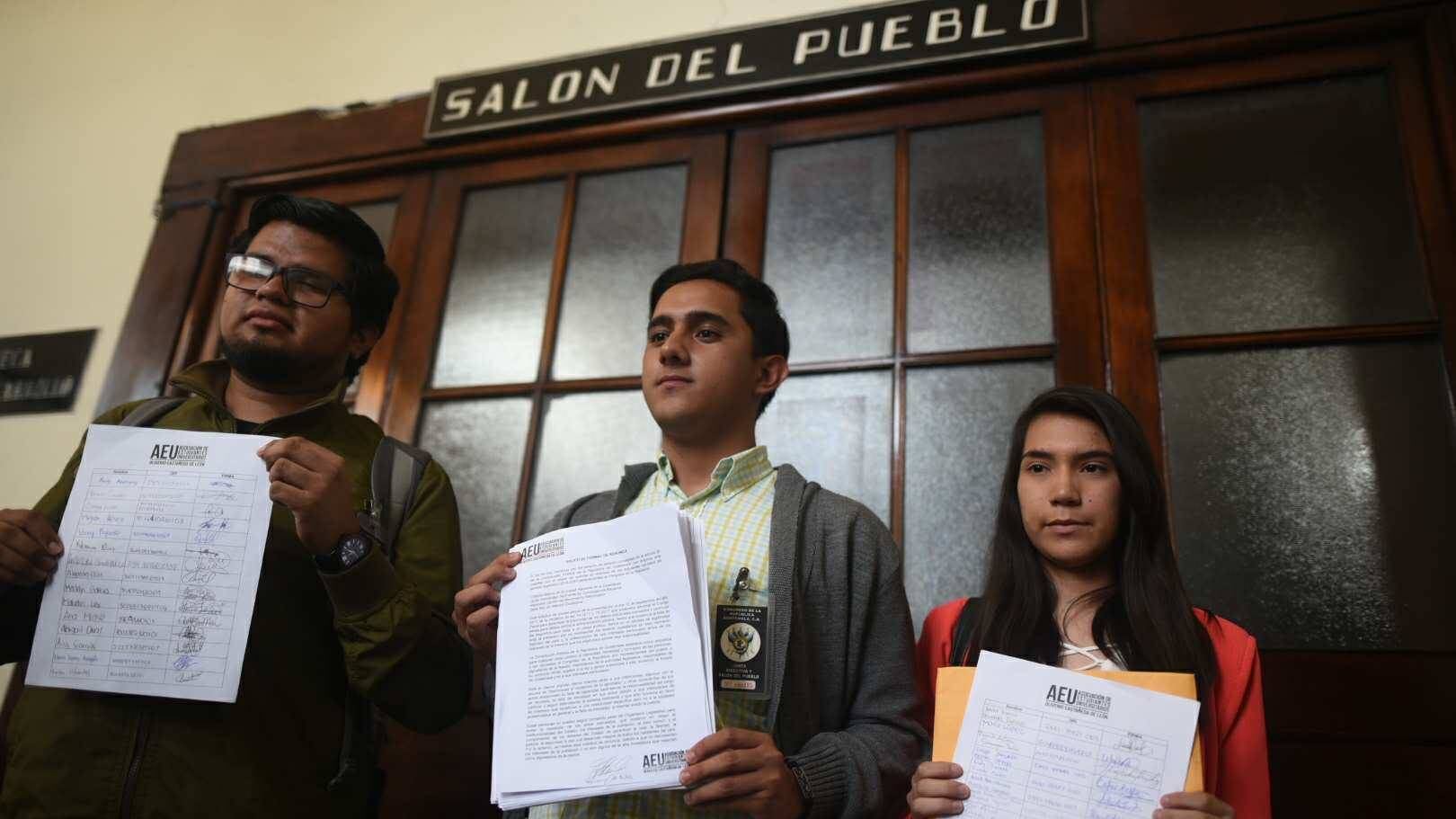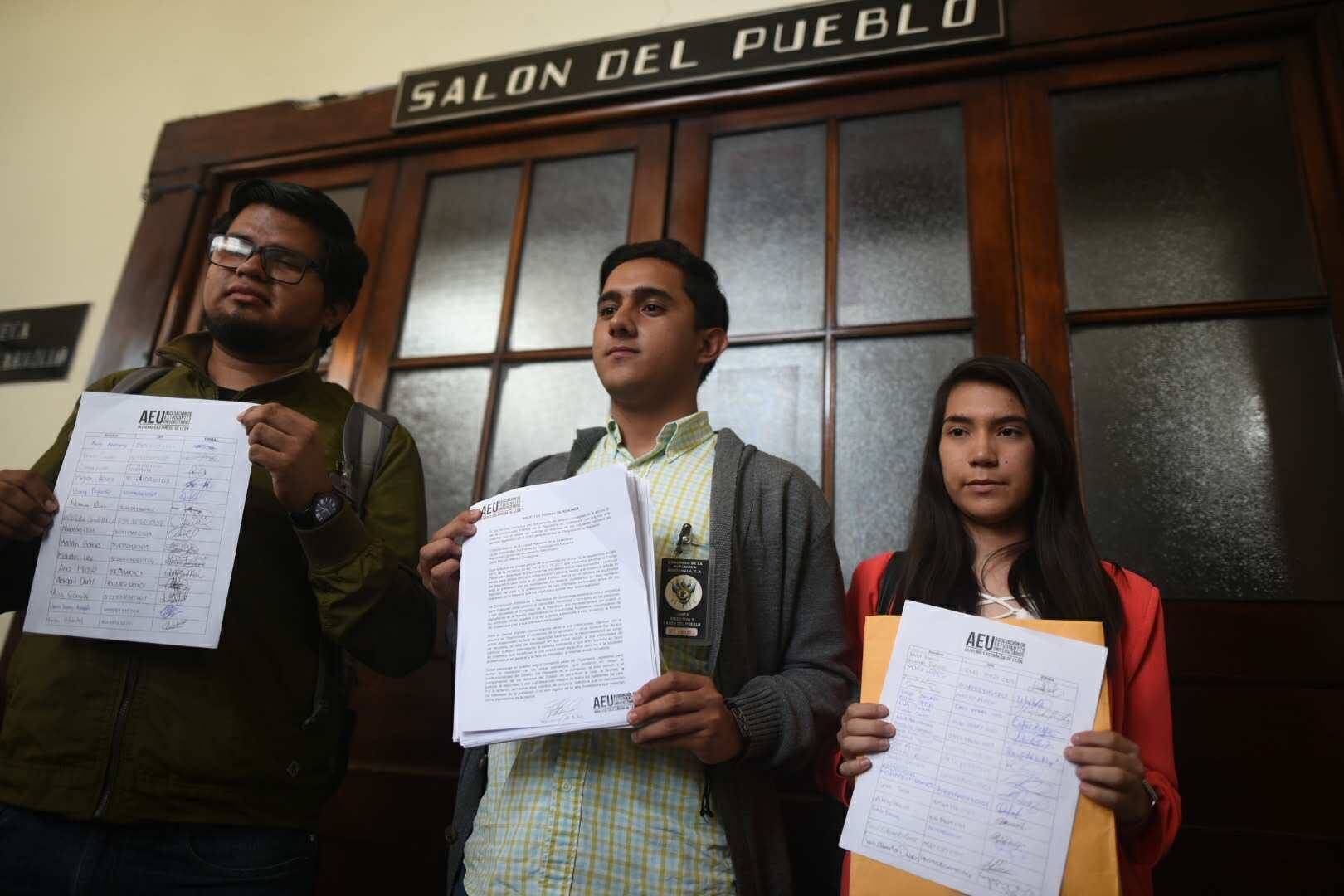 La Asociación de Estudiantes Universitarios (AEU) de la Universidad de San Carlos le entregó al Congreso la solicitud de renuncia de los diputados Orlando Blanco, Javier Hernández, Delia Bac y Alejandra Carrillo porque presentaron de urgencia nacional la iniciativa de reformas al Código Penal.