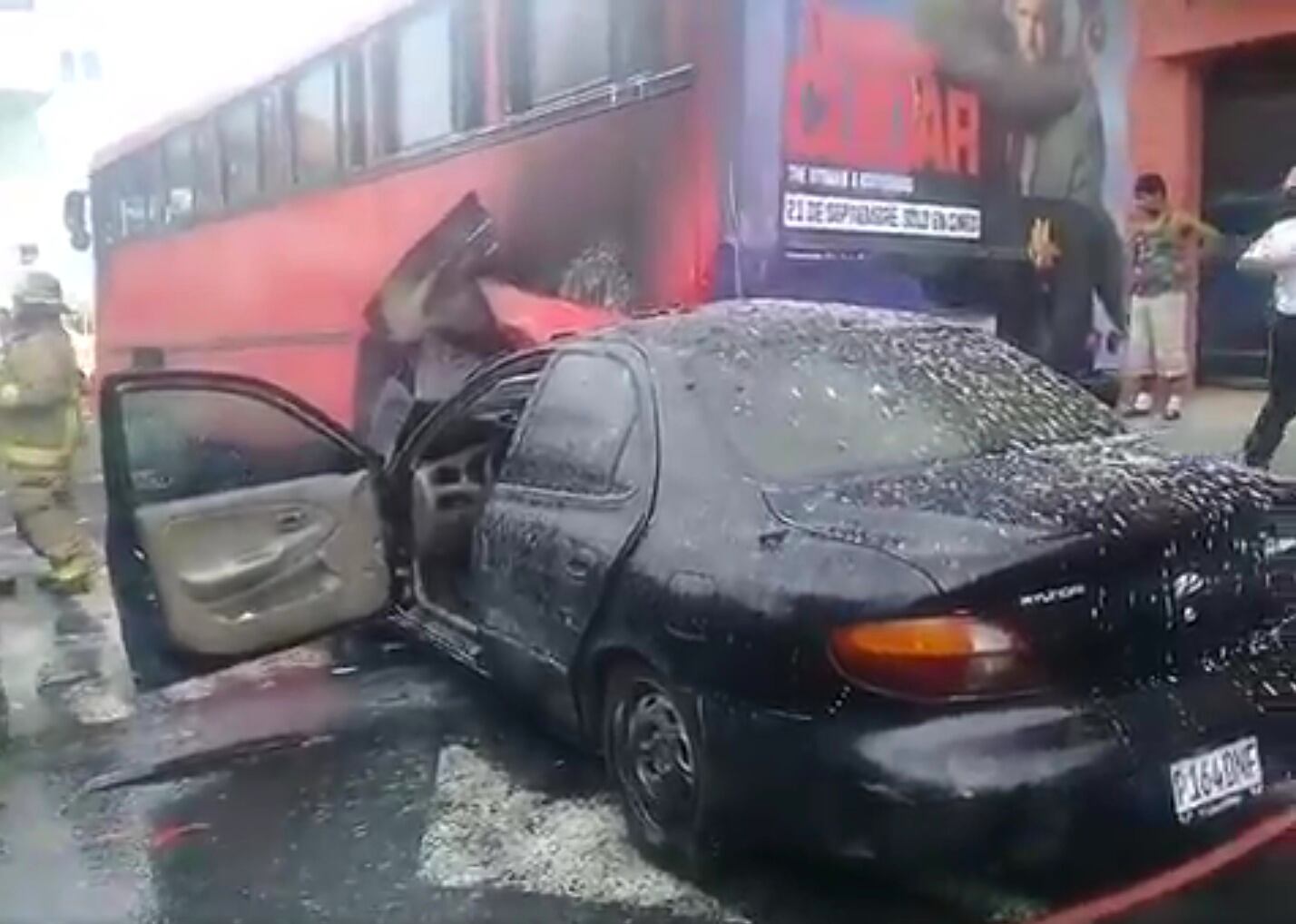 El conductor de un automóvil oscuro salió ileso luego de un accidente vial en donde, por causas que se desconocen, chocó en la parte trasera de un autobús urbano que terminó en un incendio.