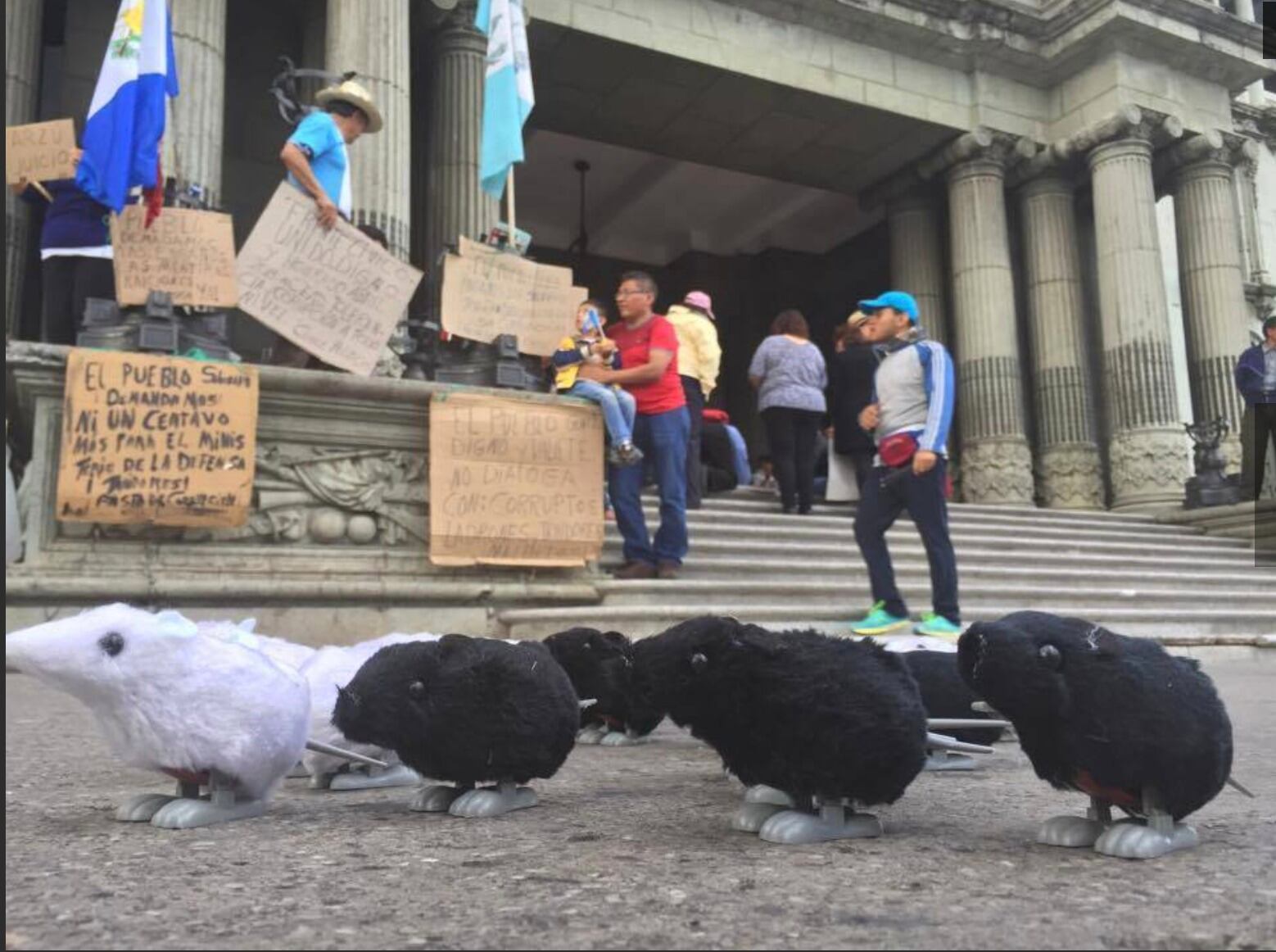 Un vendedor ambulante aprovechó la manifestación para vender ratas a Q5. Los roedores son la representación del rechazo de la sociedad a los políticos, según dijo.
