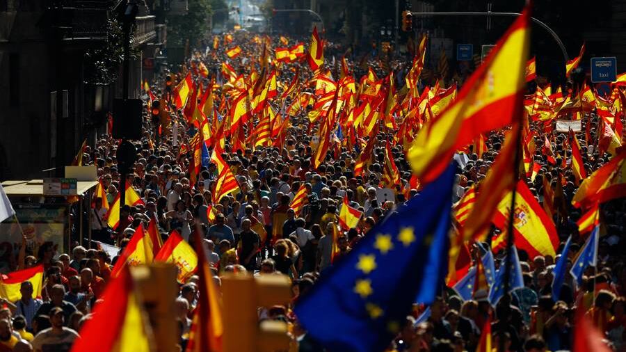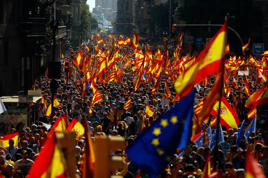 La gente llenó las calles de Barcelona en una sorprendente demostración de la unidad española. Corearon lemas como "No se engañen, Cataluña es España" y pidieron que el presidente de Cataluña, Carles Puigdemont, fuera llevado a prisión por sostener un referéndum ilegal la semana pasada. Algunos de los manifestantes subieron a los techos de las casas, incluidas familias con niños, y se inclinaron mirando hacia las calles de abajo para agitar gigantescas banderas españolas en una ciudad acostumbrada a la bandera “estelada” catalana.
