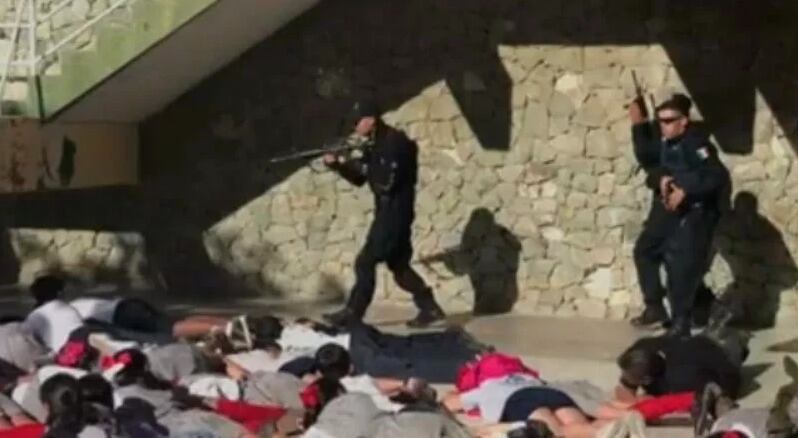 Al iniciar la falsa balacera, ambientada con sonidos de disparos mediante el sistema de audio de la escuela, los educadores pidieron a los alumnos que se tiraran al piso “boca abajo”, cubriendo sus órganos vitales y “manteniendo los brazos pegados al cuerpo”, para que los hipotéticos “agresores” creyeran que estaban muertos.