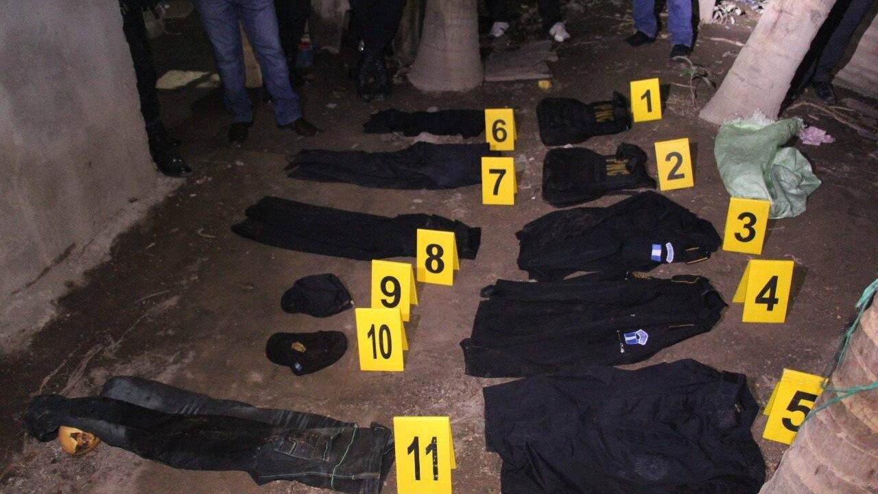 En el costal iban dos camisas con insignias de la PNC, una camisa azul, dos pantalones negros tipo comando, un pantalón azul, dos gorras con el escudo de la PNC, además, un pantalón con manchas de sangre.
