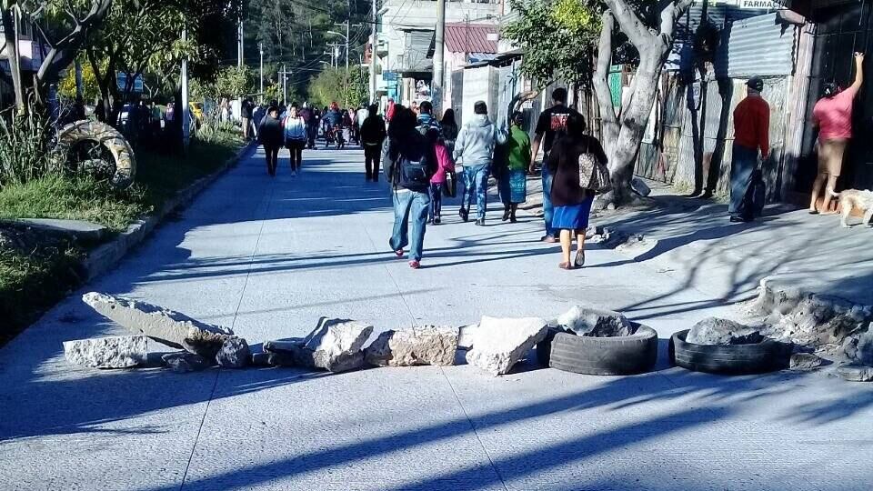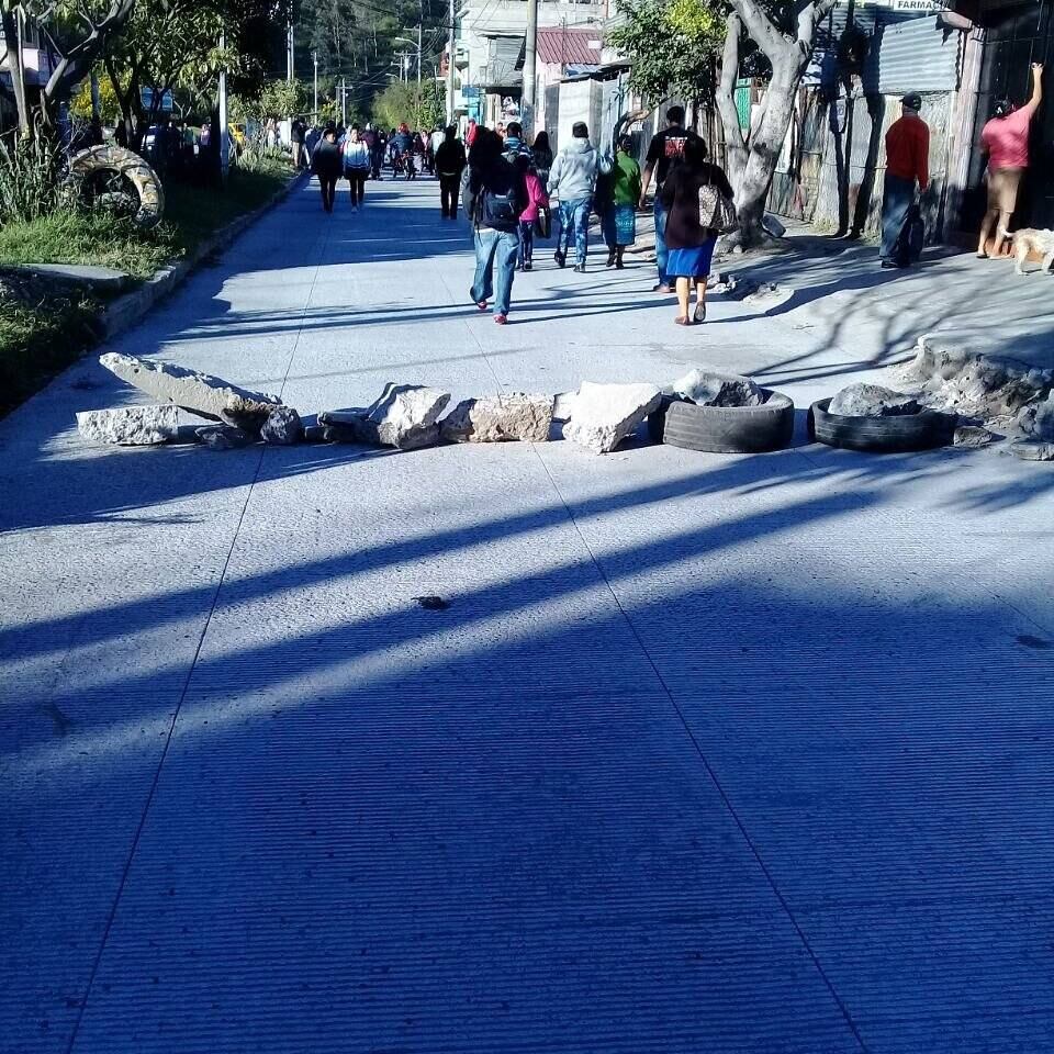 Un grupo de vecinos mantiene bloqueado el paso vehicular en El Búcaro, con sentido hacia El Mezquital y la Central de Mayoreo (Cenma), por lo cual la Policía Municipal de Tránsito (PMT) de Villa Nueva desvía el tránsito hacia otros sectores.