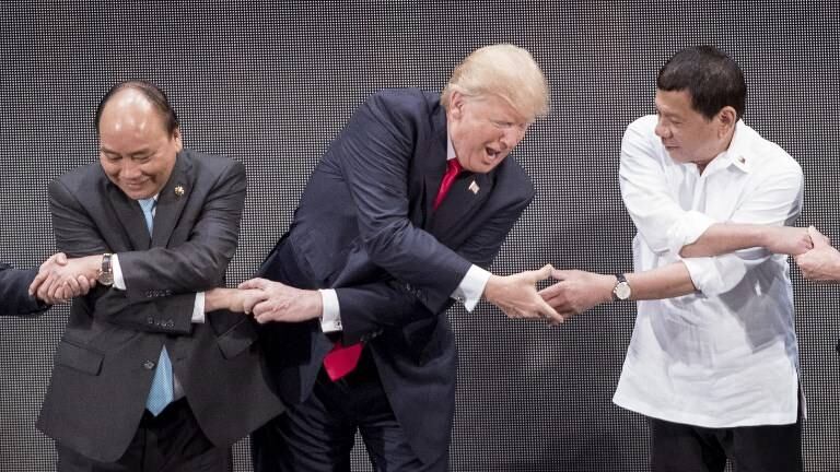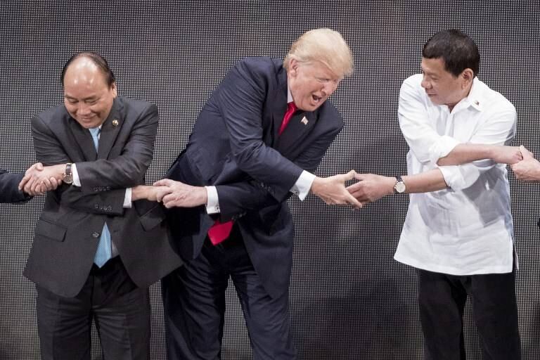 El curioso incidente provocó las sonrisas del primer ministro de Vietnam, Nguyen Xuan Phuc, y del presidente filipino, Rodrigo Duterte, quienes fueron los que recibieron el apretón de manos por parte de Trump.