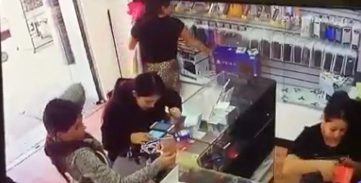 Primero observa los artículos y luego con toda tranquilidad quita objetos que se encuentran sobre una consola de videojuegos que está en una vitrina del local, para después tomarla y esconderla bajo la frazada de la niña que lleva en brazos luego se marcha del comercio como si nada.