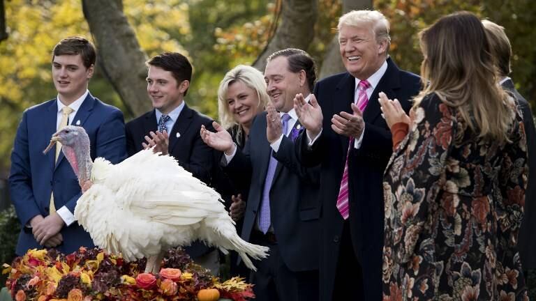 Acompañado de su esposa y primera dama, Melania, el presidente Donald Trump hizo oficial el esperado indulto y después ambos posaron junto a las aves para las cámaras de los periodistas.