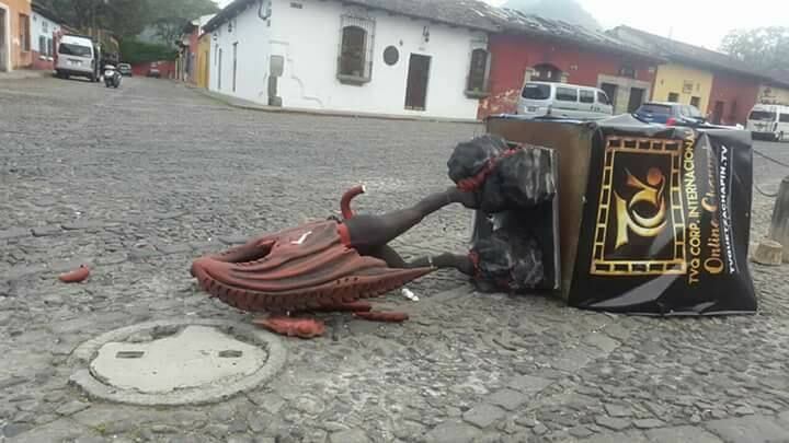 Tres días después de que fuera colocada la efigie del “diablo ecológico” en el barrio de La Concepción, Antigua Guatemala, esta fue derribada por desconocidos.
