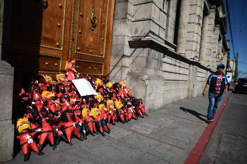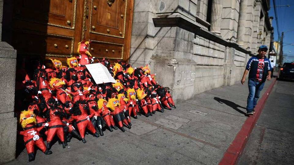 Las organizaciones Justicia Ya y Proyecto 44 colocaron hoy varias piñatas con forma de diablo frente al Congreso de la República, ello como medida de protesta ante acciones realizadas por diputados y para exigir la depuración de ese Organismo.