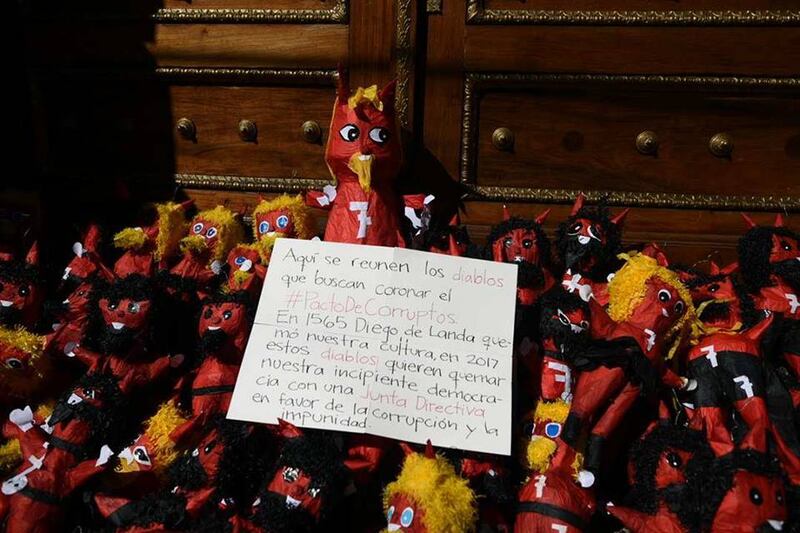 Mientras tanto, en un letrero colocado junto a las piñatas se lee: “Aquí se reúnen los diablos que buscan coronar el #PactoDeCorruptos (…) Estos diablos quieren quemar nuestra incipiente democracia con una junta directiva a favor de la corrupción y de la impunidad”.