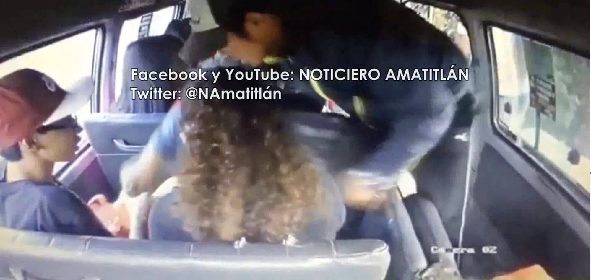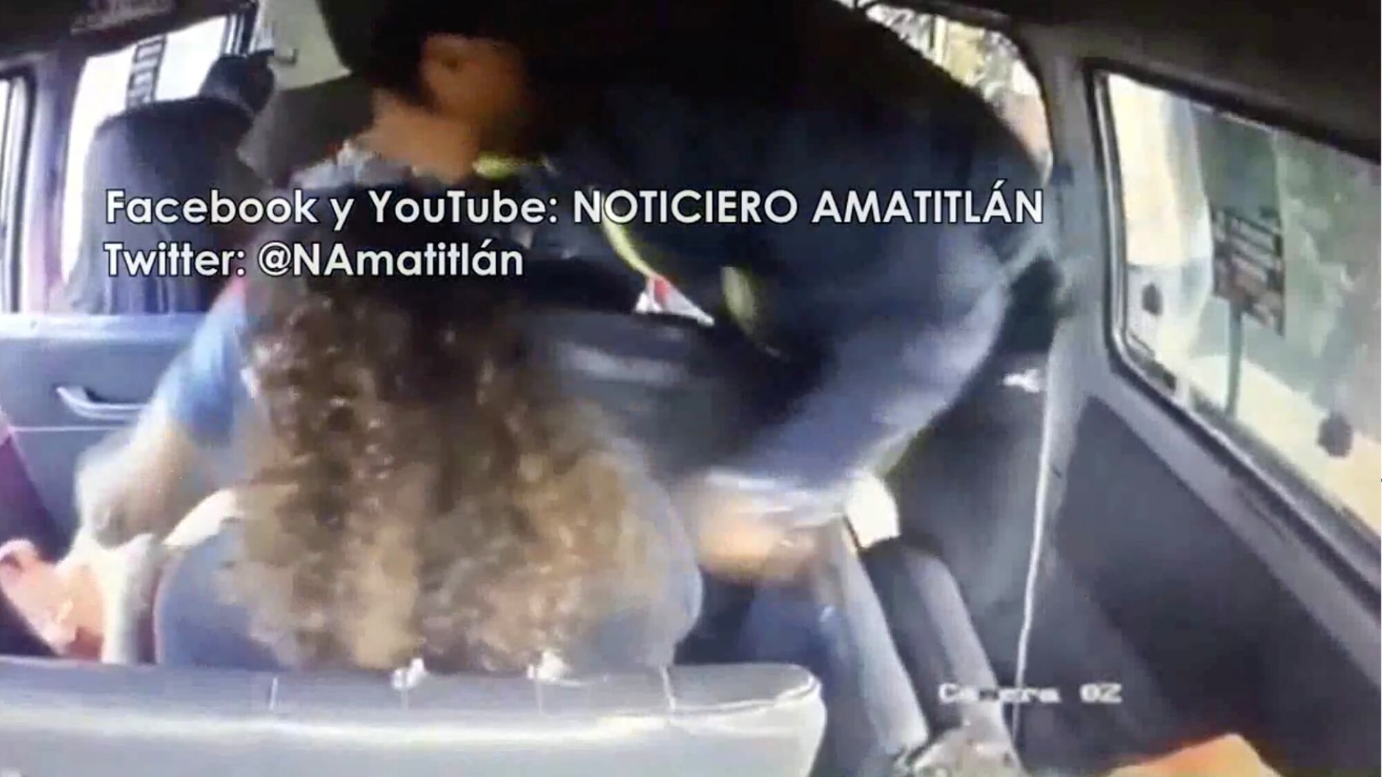 Uno de ellos se sube y despoja de sus carteras y celulares a las personas, incluyendo a un menor que se queda paralizado del susto, mientras el otro sujeto espera en la puerta del microbús para después huir.