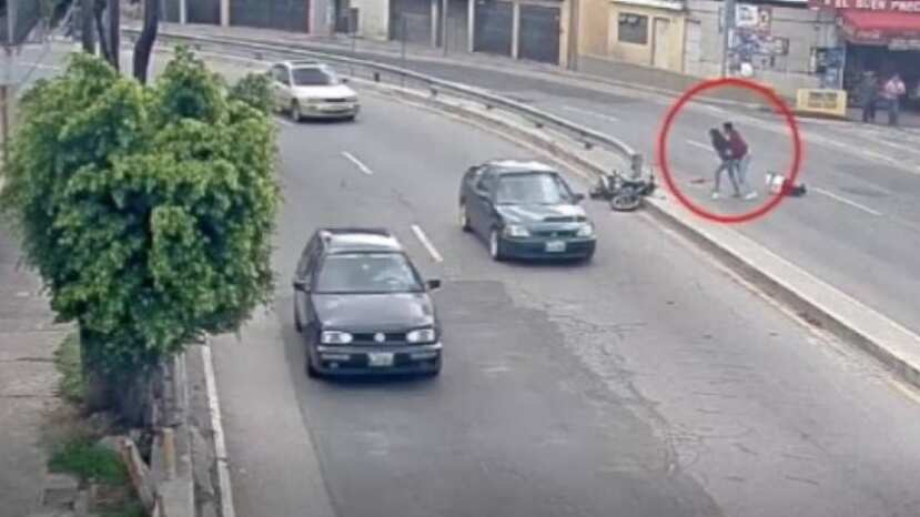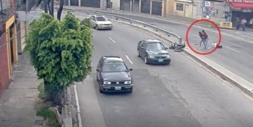 Ambos se levantan de inmediato del asfalto y corren hacia el arriate central; sin embargo, uno de los vehículos de la vía contrario detiene su paso para recoger las pertenencias.