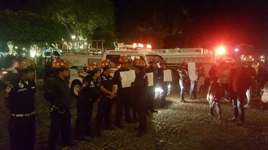 Elementos del cuerpo de Bomberos Municipales Departamentales de La Antigua Guatemala realizó una protesta anoche frente al Palacio Municipal para exigir la renuncia de la alcaldesa, Susana Asensio.