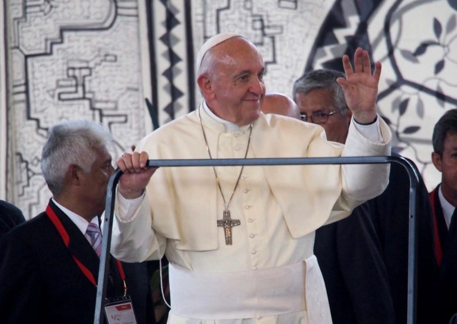 Una vez en el estrado, Francisco se bajó del pequeño papamóvil mientras el chofer lo estacionaba a un lado. El papa argentino subió lento para dar su discurso a los miles de asistentes y recibir el saludo de los dirigentes nativos.