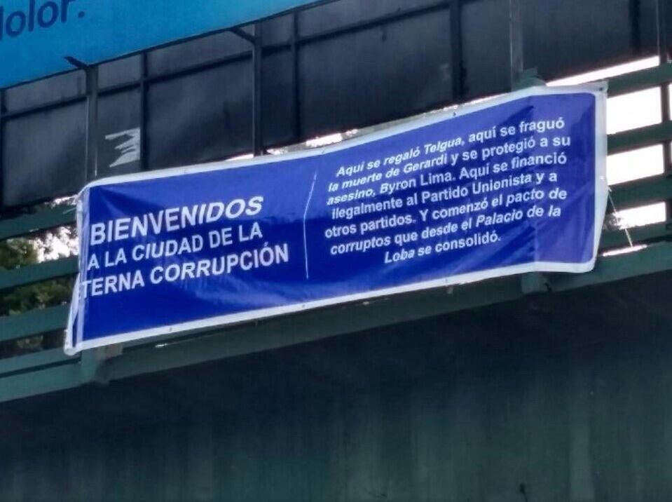“Bienvenidos a la Ciudad de la Eterna Corrupción”, se lee en unas mantas vinílicas colocadas en pasarelas al ingreso de la zona 10, desde ruta a El Salvador y en otra en el límite con Mixco.