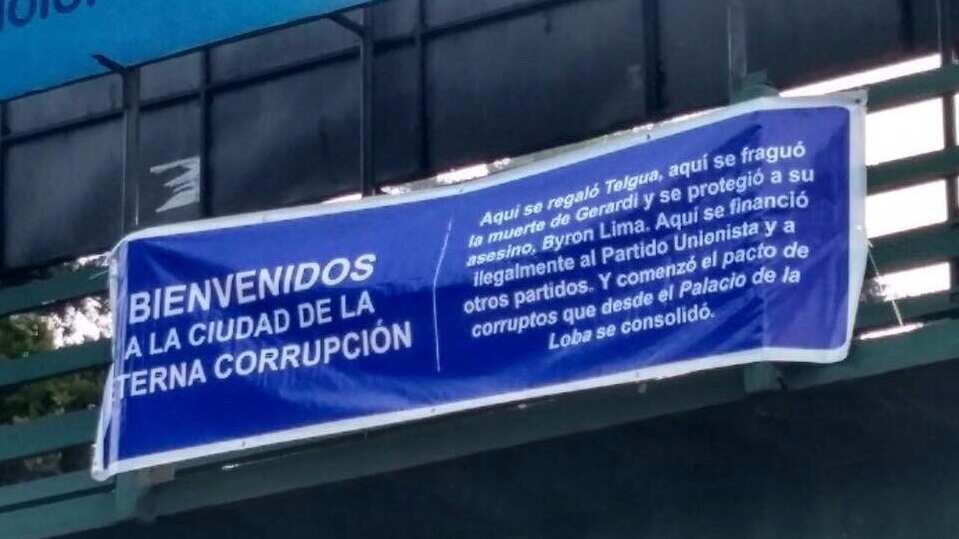 “Aquí se regaló Telgua, aquí se fraguó la muerte de Gerardi y se protegió a su asesino, Byron Lima. Aquí se financió ilegalmente al Partido Unionista y a otros partidos. Y comenzó el pacto de corruptos que desde el Palacio de la Loba se consolidó”, se lee en el cartel.