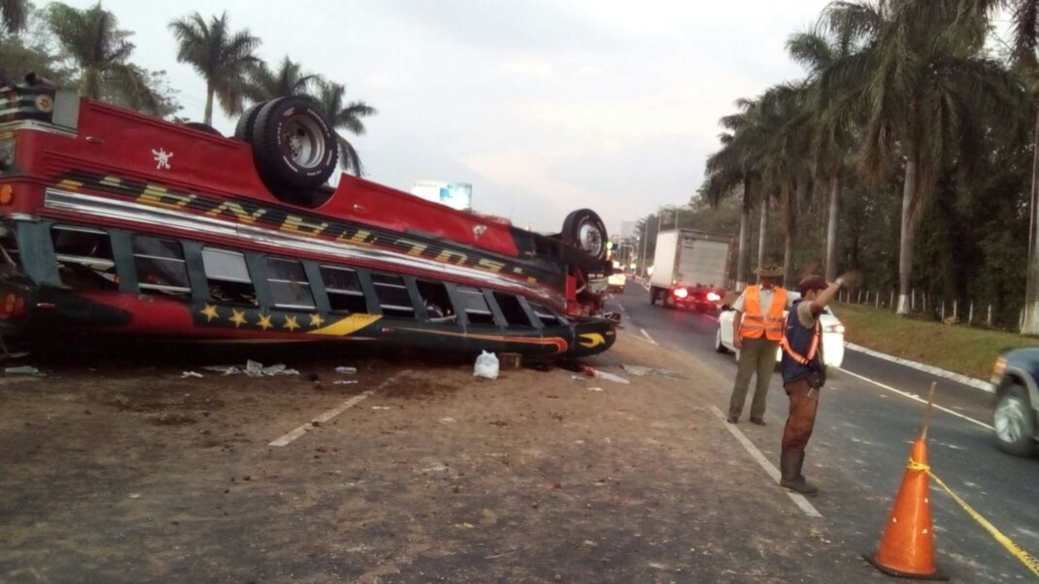 Un autobús de los transportes "Sultanita" que se dirigía a Mazatenango, Suchitepéquez volcó en el kilómetro 52.5 de la autopista PalÍn, Escuintla.