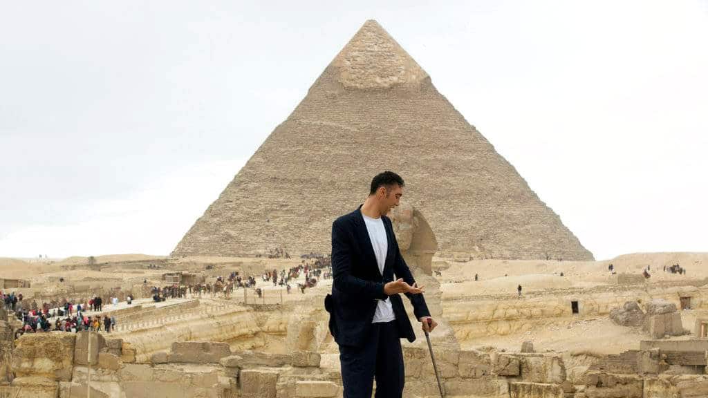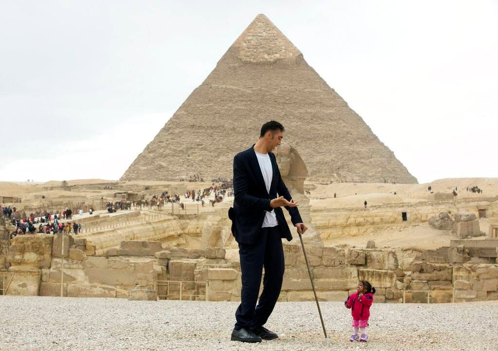 Egipto fue el escenario del inusual encuentro entre Sultan Kosen, de 34 años y Jyoti Amge, de 24. El turco posee el récord Guiness como el hombre más alto del mundo, con sus 2.46 metros de altura, mientras que la originaria de la India posee el título de ser la más baja, con apenas 62.8 centímetros.