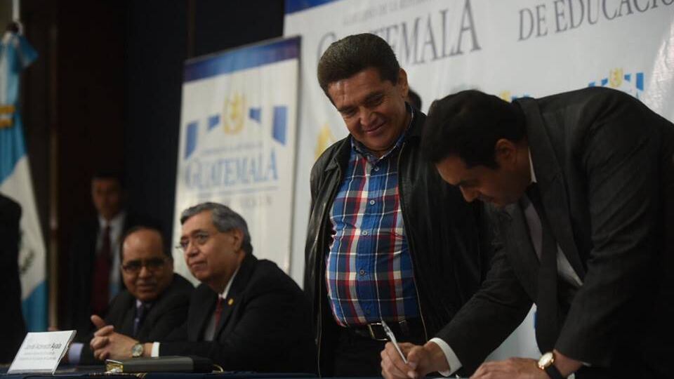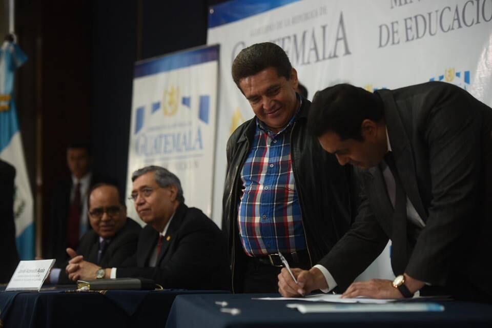 El Ministerio de Educación y el líder sindical Joviel Acevedo firmaron los acuerdos que alcanzaron en la negociación del nuevo pacto colectivo, el cual contempla un incremento del cinco por ciento para el salario de los maestros y un bono anual de Q2 mil 500.