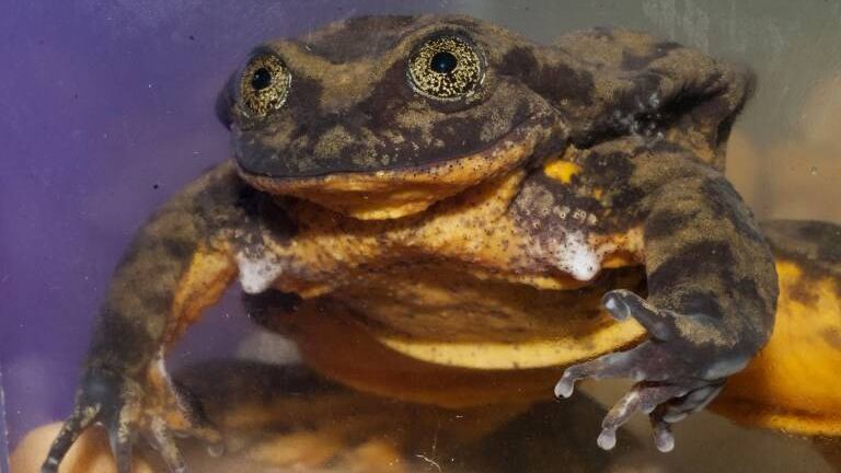 Es un anfibio tímido, que suele esconderse bajo las rocas. Solo sale cuando los cuidadores le sirven sus platos preferidos: gusanos de tierra, isópodos y caracoles.