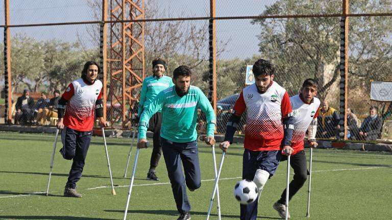 El árbitro pita el comienzo del partido. Apoyándose en sus muletas, un joven juega al fútbol con otros mutilados de la guerra en Siria para levantar el ánimo.
