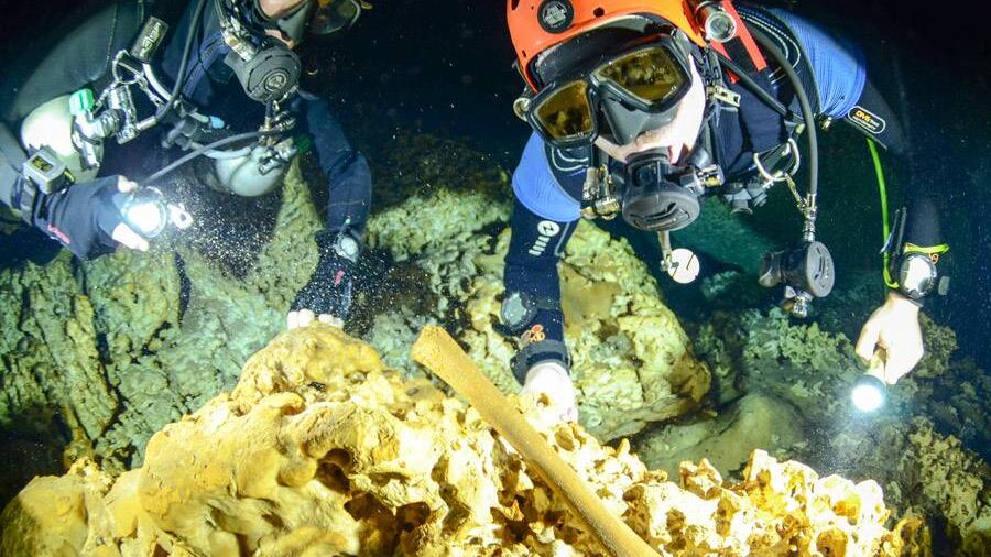 Los investigadores encontraron un cráneo humano que ya estaba petrificado o concrecionado mucho antes de que el sistema de cavernas se inundara hace unos 9.000 años.