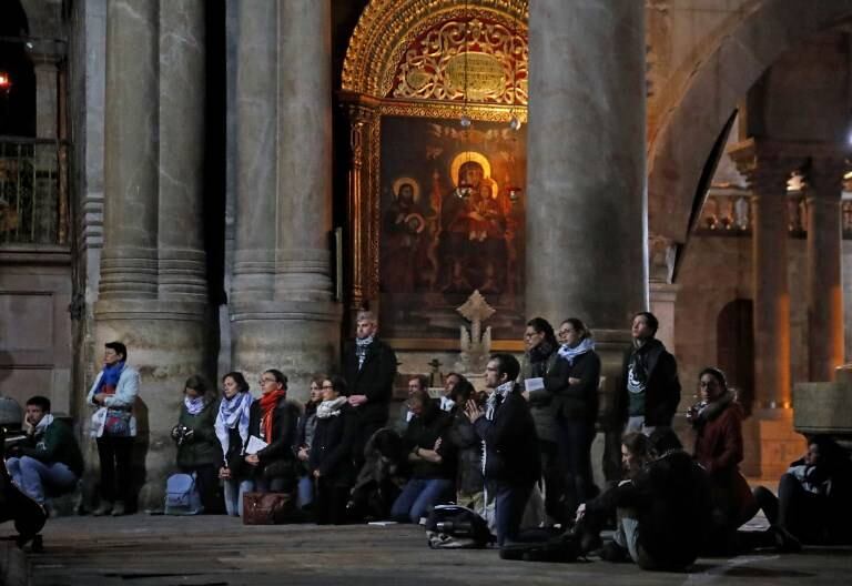 Pese a que era de madrugada, unos cuantos minutos bastaron para que un grupo de fieles católicos emergiera por los callejones oscuros de la Ciudad Vieja para visitar el sitio.