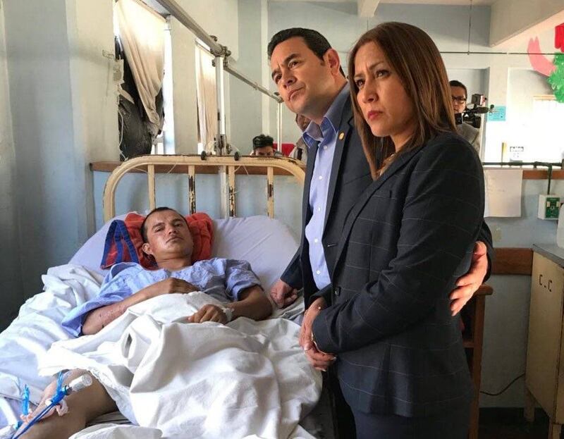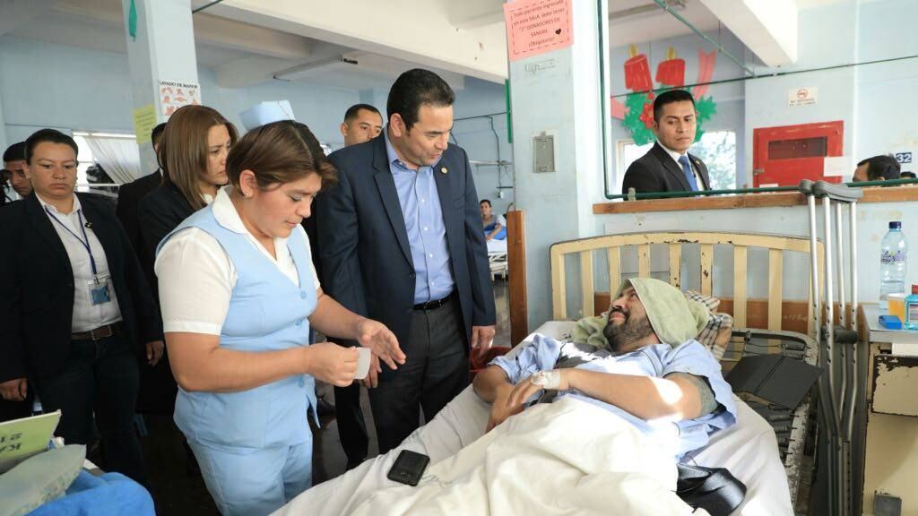 El presidente Jimmy Morales y su esposa Patricia Marroquín llegaron al Hospital Roosevelt y visitaron a las personas que resultaron heridas en un accidente de tránsito que ocurrió el viernes en el kilómetro 18 de la ruta Interamericana.
