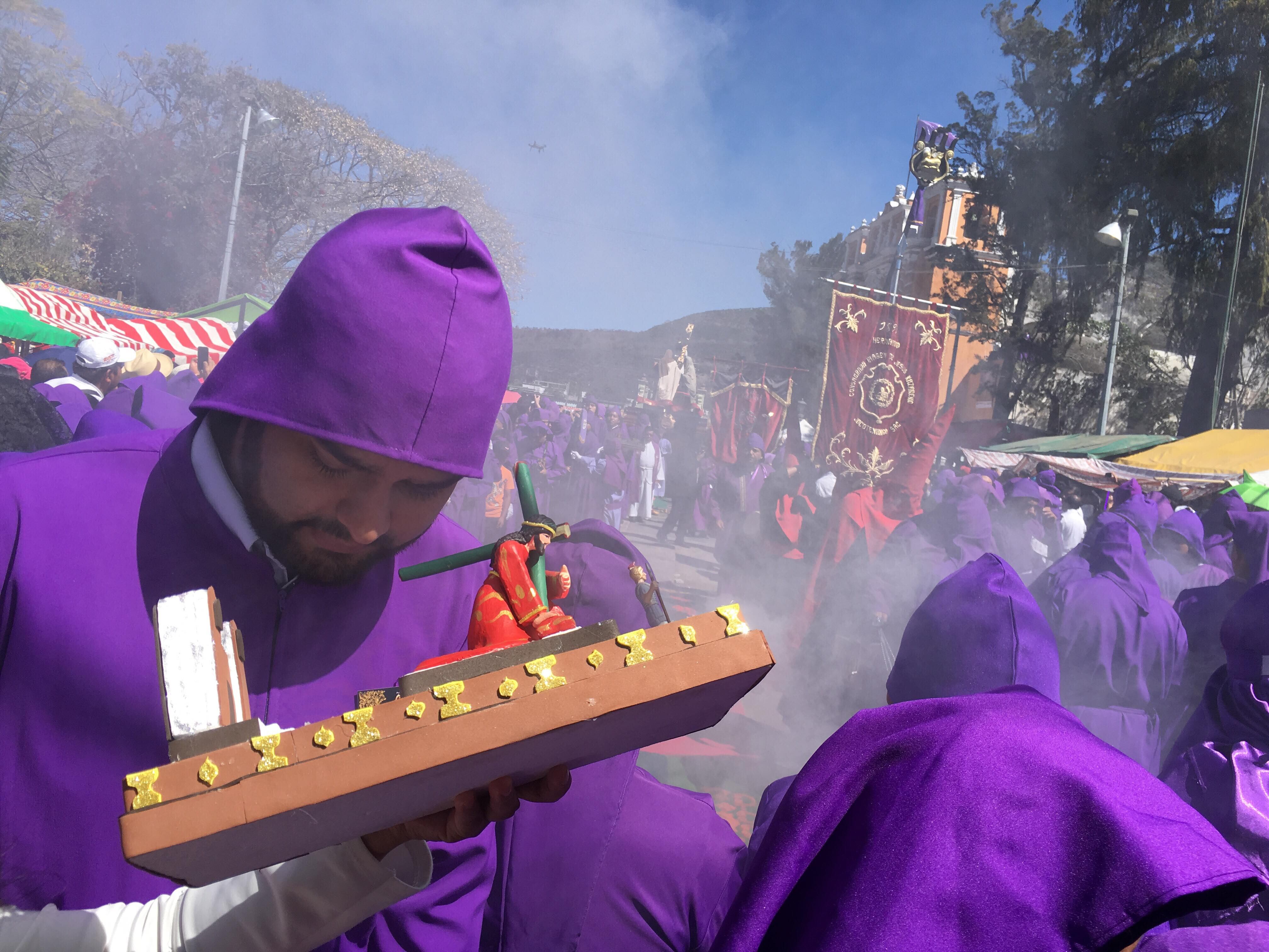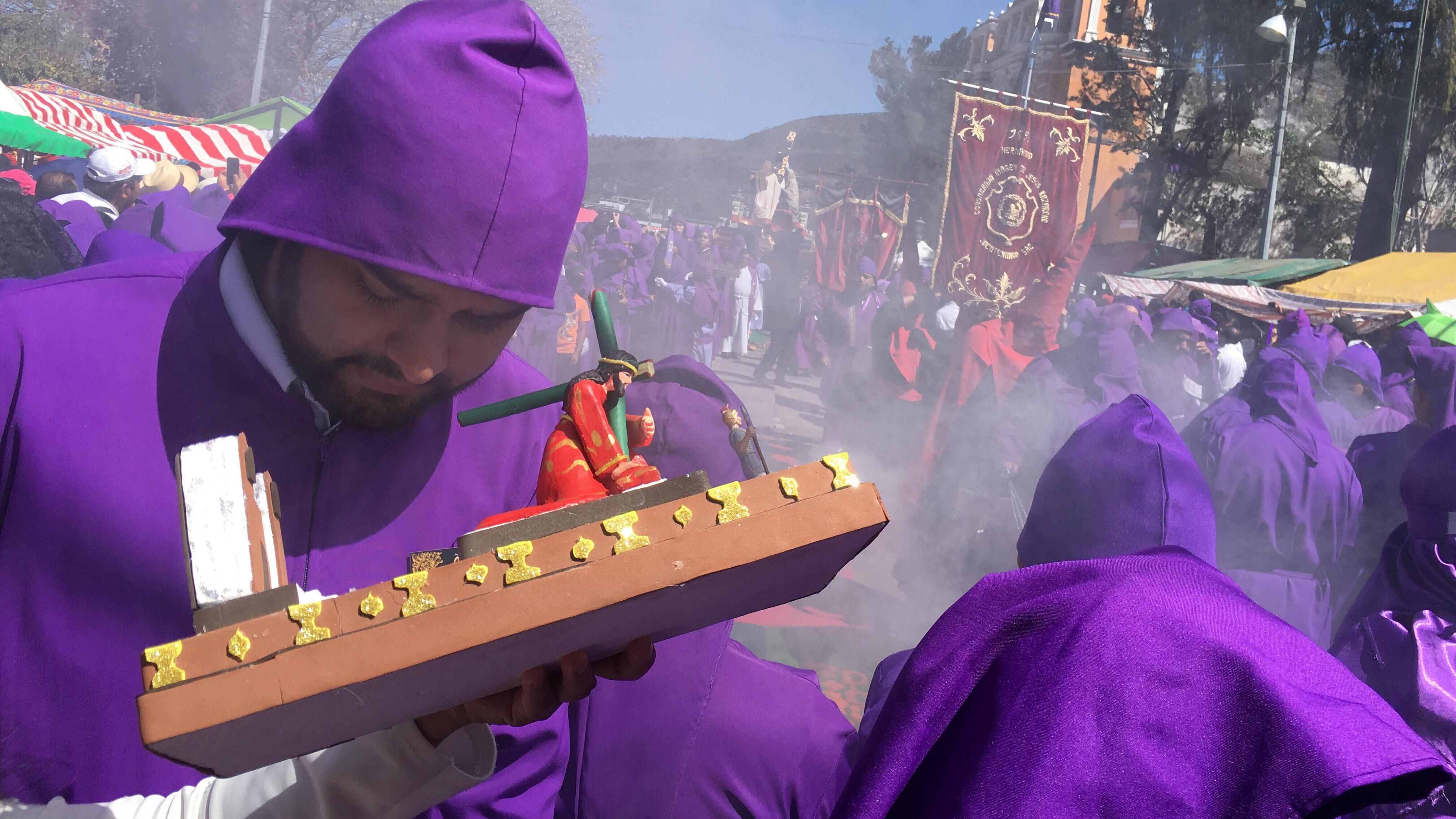 Bajo un inclemente sol y filas interminables de cucuruchos con el riguroso morado, los monumentales muebles procesionales recorrieron las calles y avenidas de Jocotenango, así como de la mítica Antigua Guatemala.