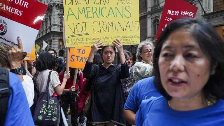 "¡Dejen de jugar con nuestras vidas!", "¡Queremos una solución permanente!", pidieron decenas de jóvenes este lunes, al llegar la fecha elegida por el gobierno del presidente Donald Trump para el fin del programa DACA, que les protege de la deportación.