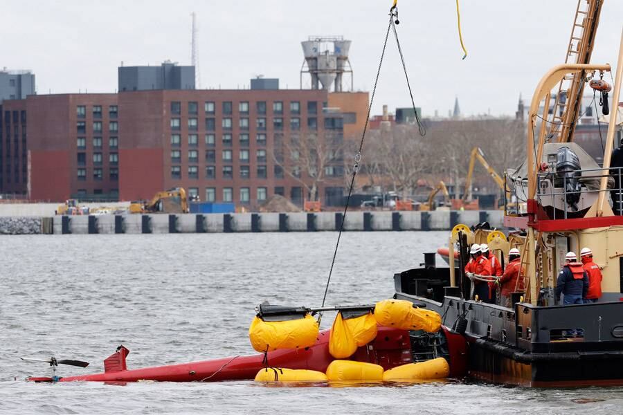 El helicóptero rojo, propiedad de la compañía turística Liberty, cayó al río con seis personas a bordo, incluido el piloto, cerca al vecindario neoyorquino de Upper East Side hacia las 19H00 locales (23H00 GMT) del domingo y tras un día soleado.