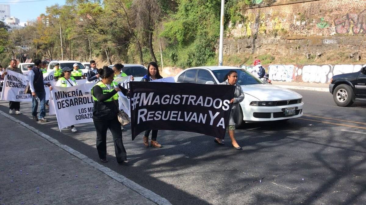 Un grupo de trabajadores de la Minera San Rafael realizan este miércoles una manifestación pacífica en la Ciudad de Guatemala. La marcha salió desde la zona 4 capitalina y se dirige a la Corte de Constitucionalidad (CC).