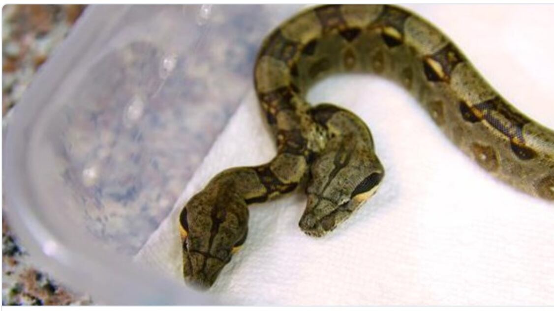 Dos cabezas, dos corazones y, al parecer, dos tubos digestivos, estas son las características de una boa constrictor de pocos días de nacida que descubrió un criador de serpientes en Florida, Estados Unidos.