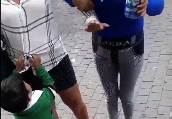 En el clip se puede ver a un niño, aproximadamente de unos tres años, abrazar a una de las mujeres, y luego deambular por la calle.