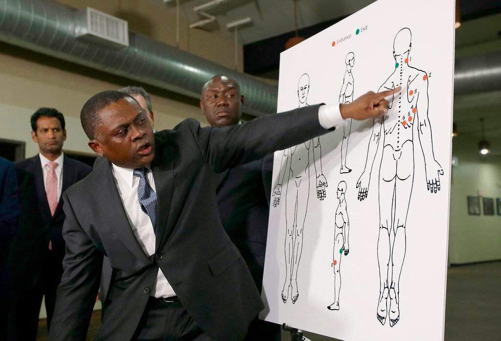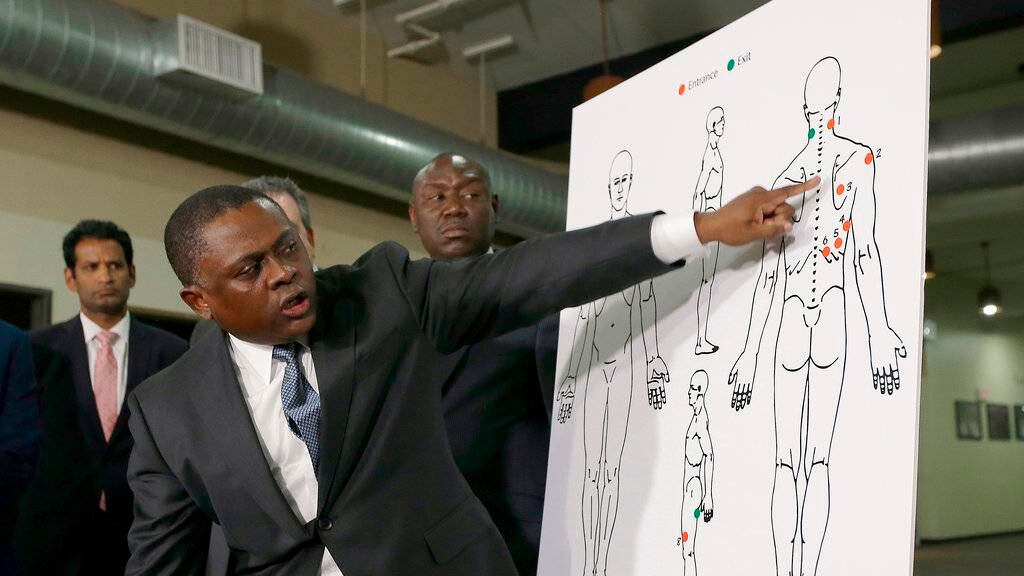 “La propuesta presentada de que estaba arremetiendo contra los agentes, lo que significa que estaba de frente a los agentes, no concuerda con la evidencia forense que se tiene”, dijo Omalu en una conferencia de prensa con Benjamin Crump, abogado de la familia.
