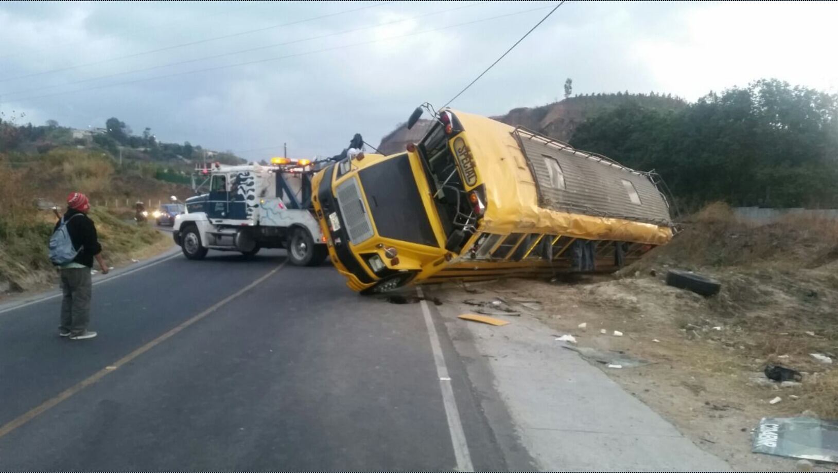 El bus que trasladaba a unas 60 personas volcó este sábado en el puente La Prosperidad, zona 12 de Villa Nueva, informaron los Bomberos Municipales.