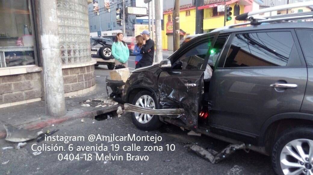 Un conductor colisionó su vehículo tipo camioneta contra unos postes de cemento, esto ocurrió en la 6ª avenida y 19 calle de la zona 10. Amílcar Montejo, intendente de la Policía Municipal de Tránsito (PMT) capitalina, explicó que el hecho no dejó personas heridas, solo daños materiales.