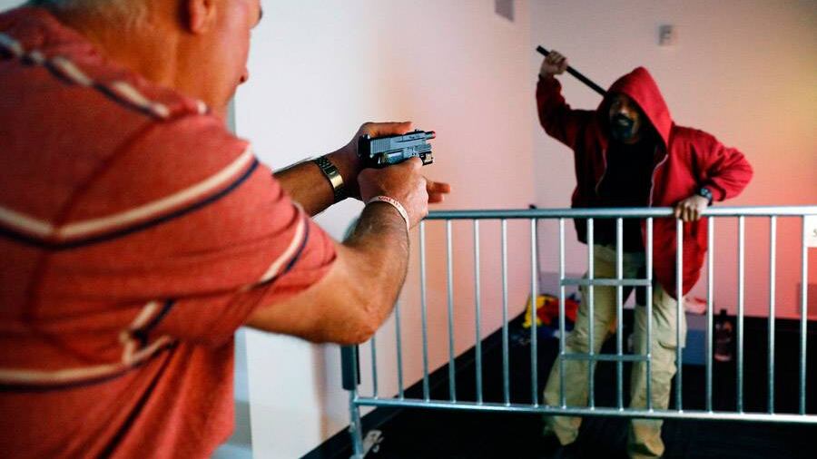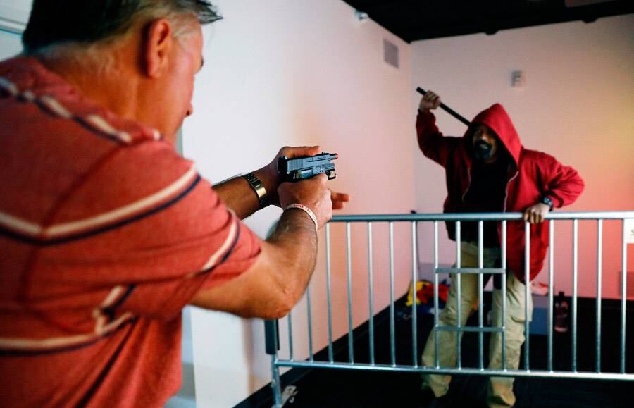 La visitante participaba en una exposición interactiva en la que los visitantes usan una pistola que dispara perdigones y los coloca en situaciones parecidas a las que un policía puede enfrentar en la vida real.