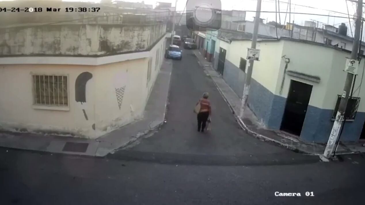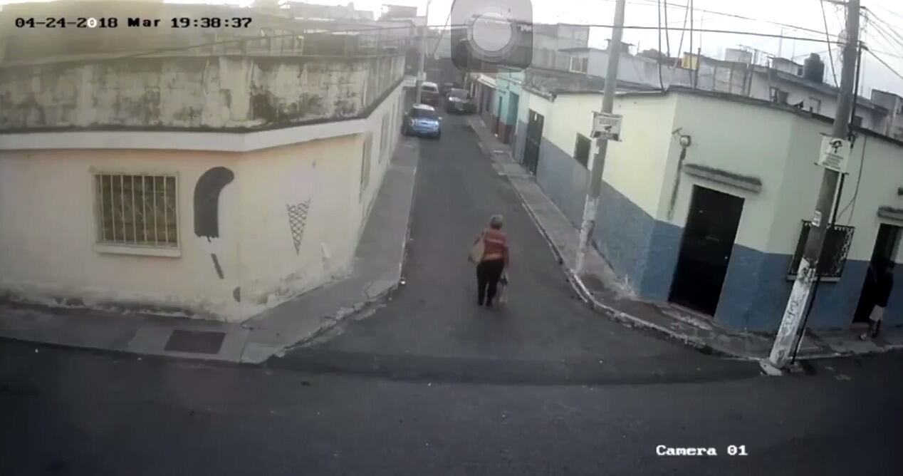 En las imágenes se observa que la mujer está detenida entre las calles, luego empieza a caminar y es cuando aparece desde una esquina el atacante vestido con una pantaloneta beige y un sudadero negro.