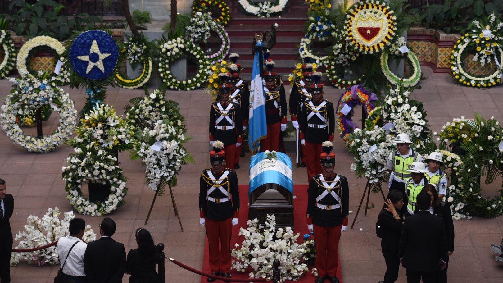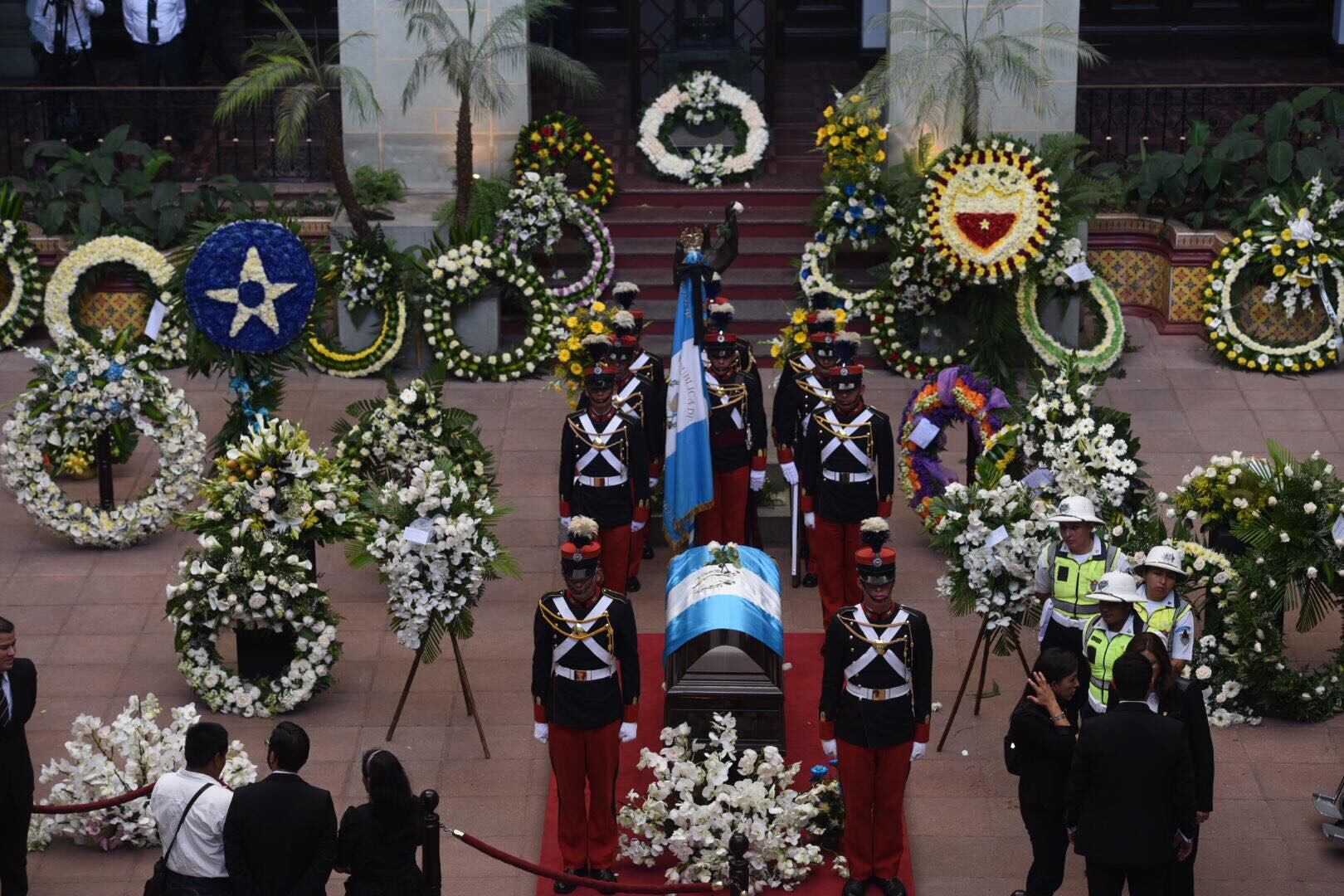 Después de las honras fúnebres al alcalde capitalino en el Salón Banderas, del Palacio Nacional, fue llevado al Patio de la Paz, donde los guatemaltecos podrán despedir a uno de los políticos con más trayectoria en el país.