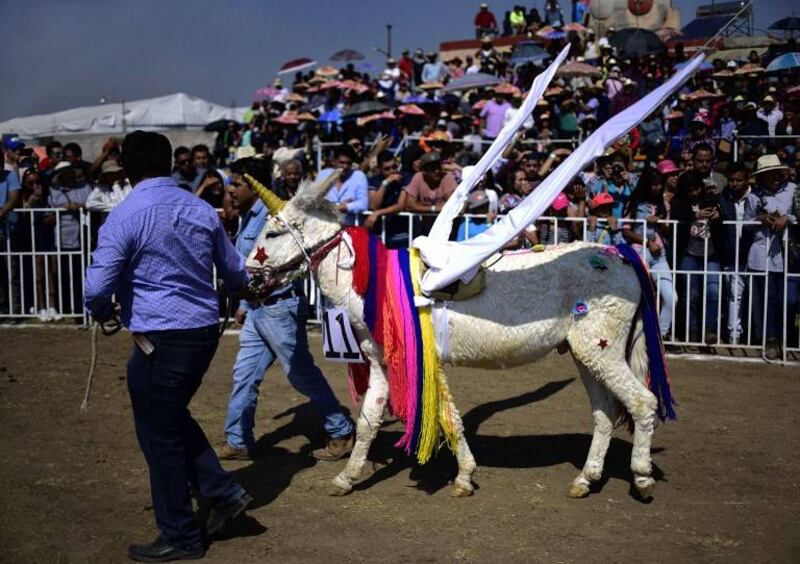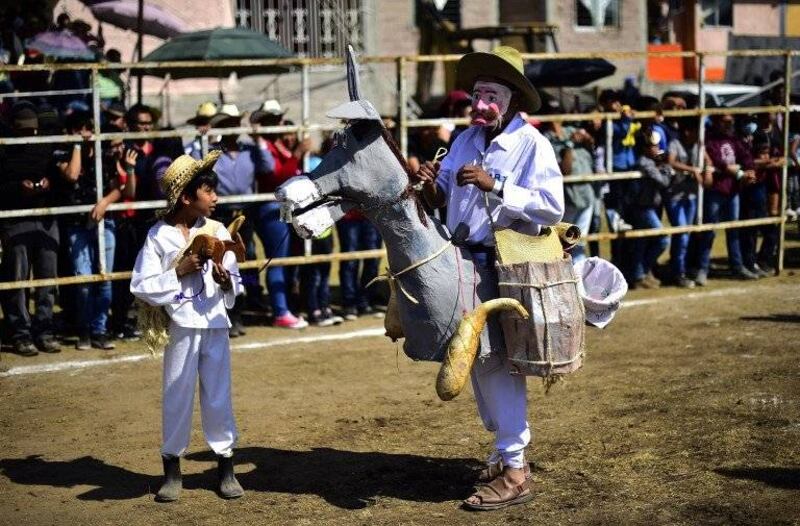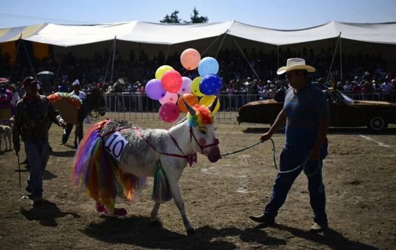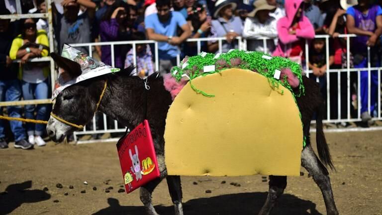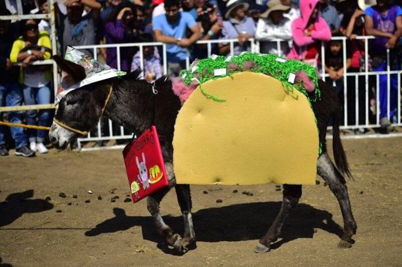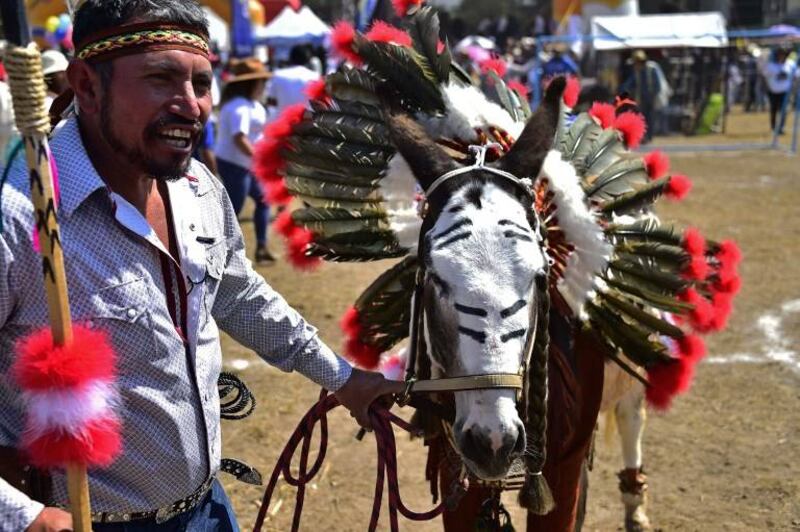 El "burro apache" desfiló con un tocado de plumas y no paró de recibir aplausos y vítores en el concurso para encontrar al mejor disfrazado de su especie en Otumba, un suburbio cercano a Ciudad de México.