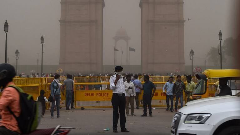 A última hora del miércoles, un velo blanco envolvió la capital, Nueva Delhi, dificultando la visibilidad antes de dar paso a fuertes vientos.