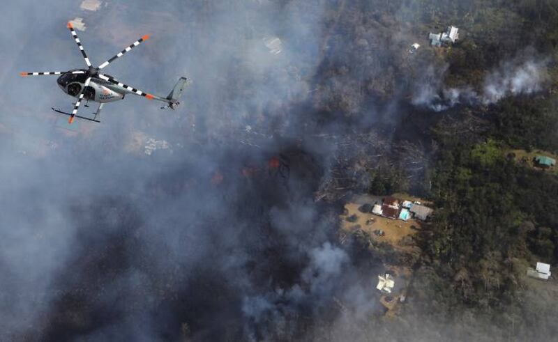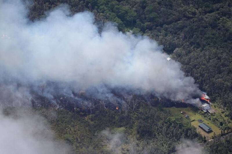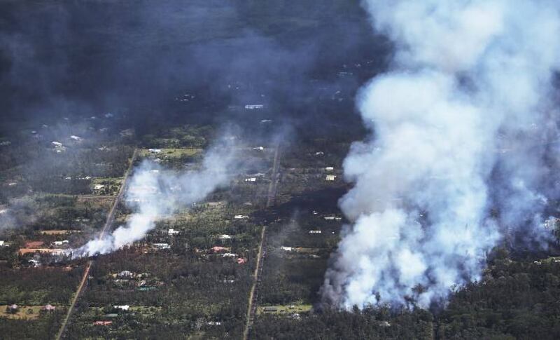 Imágenes aéreas mostraron riachuelos naranjas de lava filtrándose por el barrio de Leilani Estates, cubriendo algunas calles y provocando pequeños fuegos.