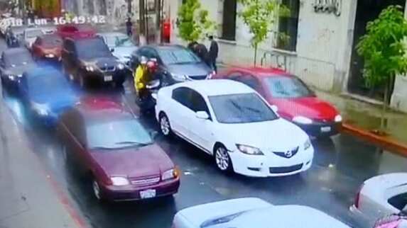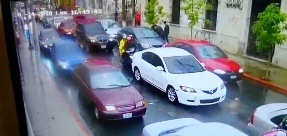 Los hombres se acercan a la ventanilla del piloto y le muestran un arma de fuego. Segundos después, el piloto les entrega sus pertenencias y los delincuentes se marchan como si nada en la calle.